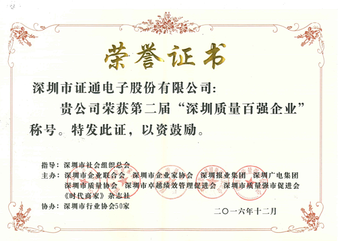 歷時(shí)八個(gè)月,深圳市證通電子股份有限公司在深圳市近500家申報(bào)企業(yè)中“鏖戰(zhàn)”而出,榮膺第二屆“深圳質(zhì)量百強(qiáng)企業(yè)”稱號,同時(shí)獲得該榮譽(yù)的還有萬科企業(yè)股份有限公司、中興通訊股份有限公司等100家企業(yè)單位。