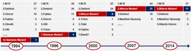 長期以來,NCR、Diebold、Wincor Nixdorf三家公司(簡稱“國際三巨頭”)占據了全球ATM大部分市場份額,NCR在全球ATM領域市場份額更是連續多年占據首位。2015年11月,Diebold與Wincor Nixdorf達成收購協議,合并成立新公司DieboldNixdorf,新公司取代NCR成為全球最大的ATM制造商。